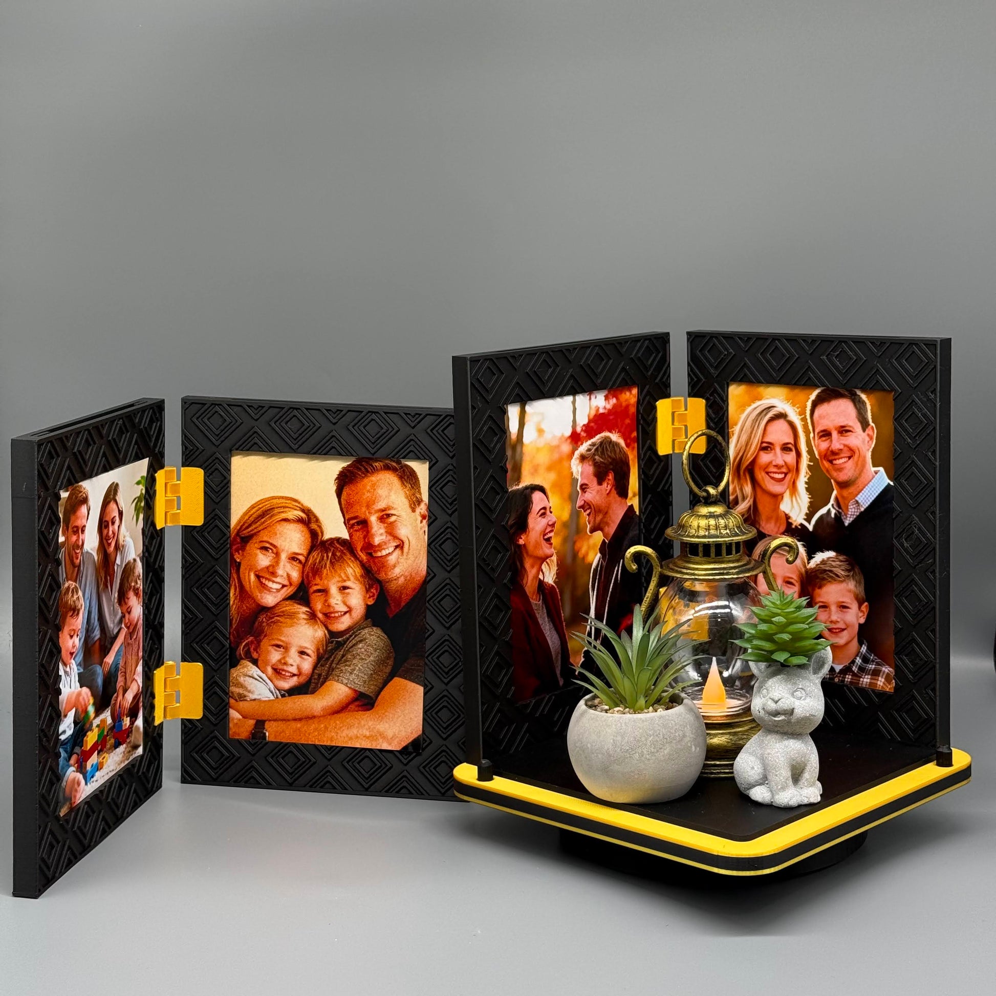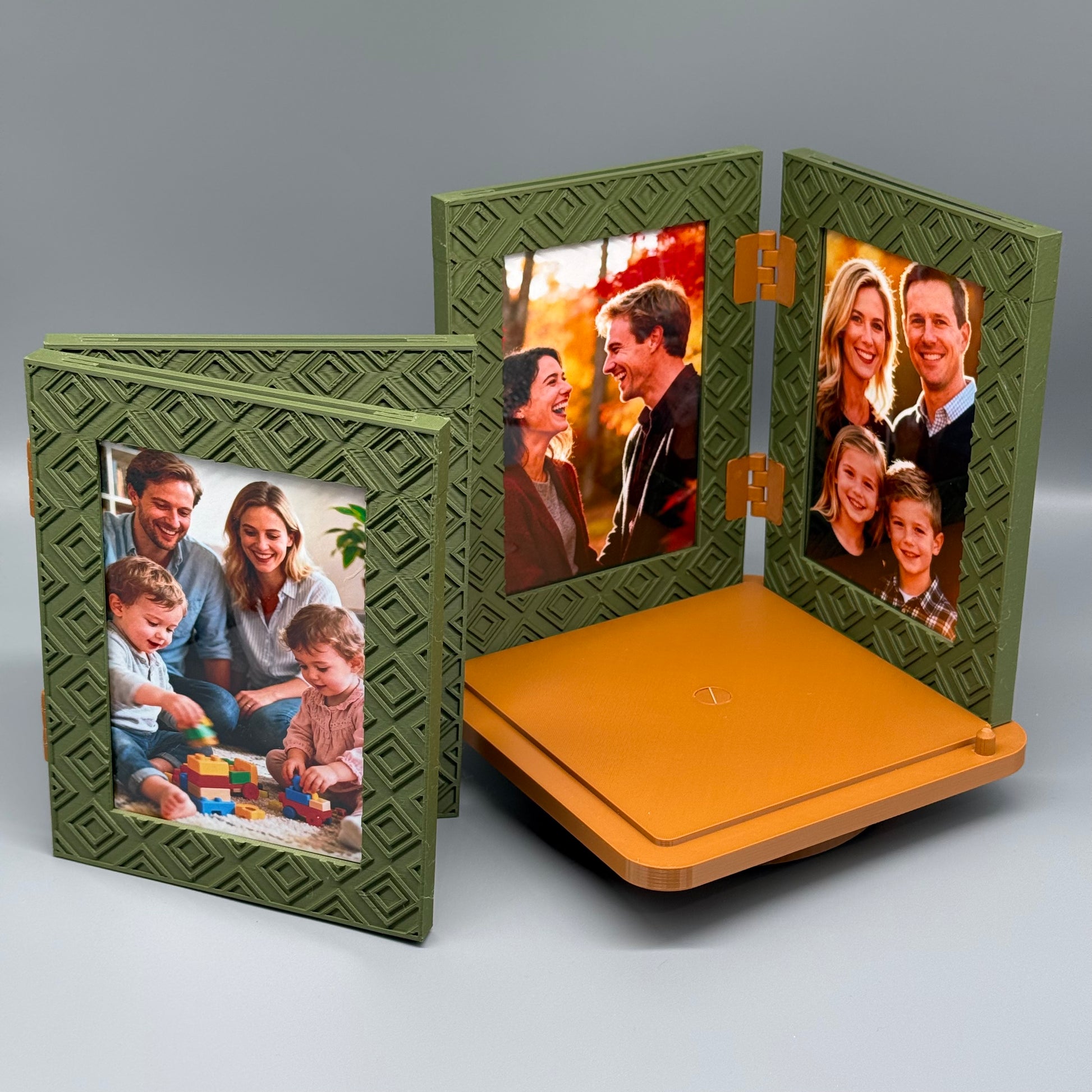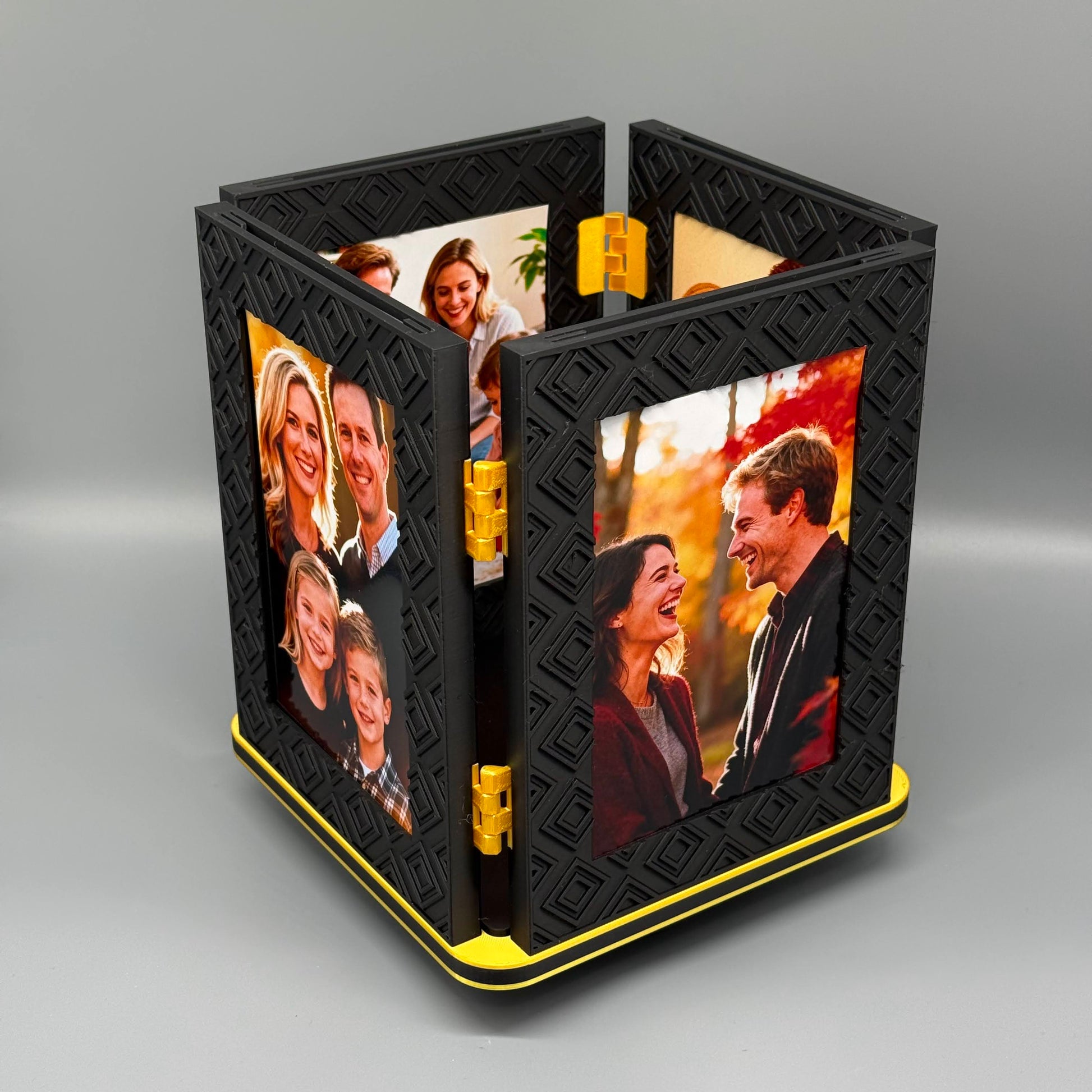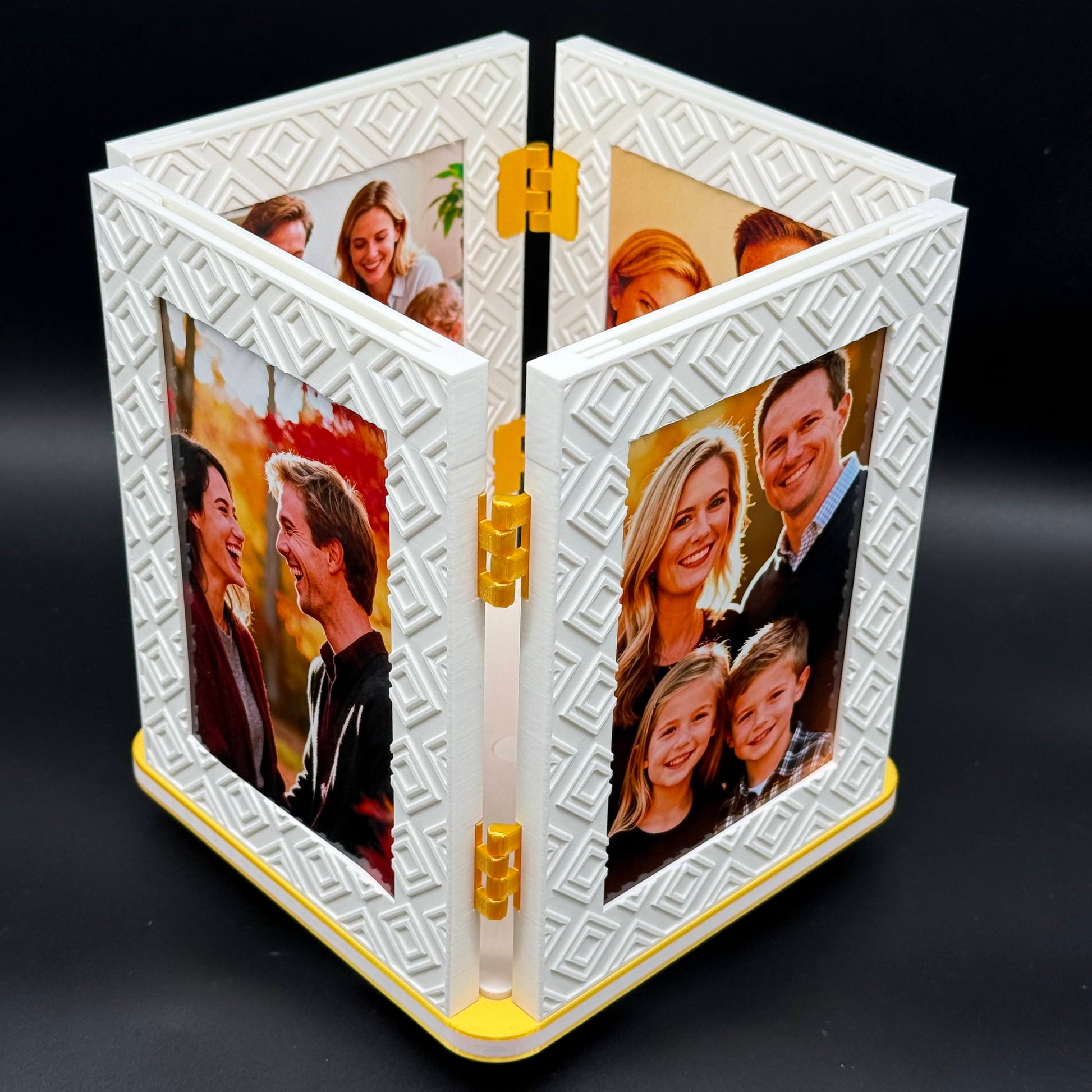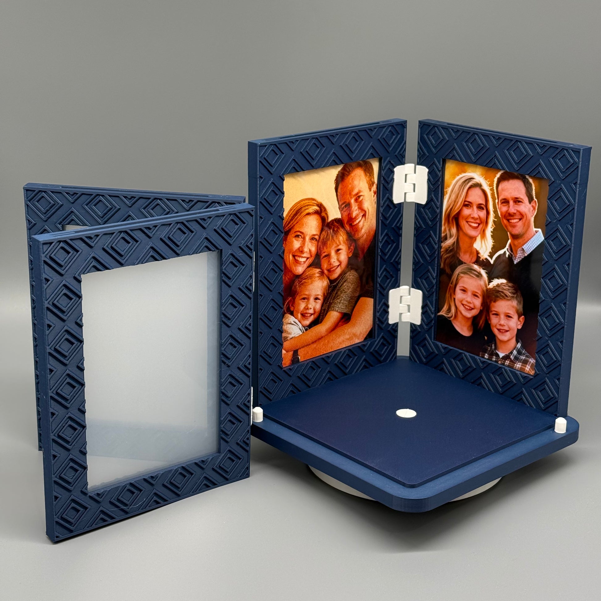 A set of four photo frame that can showcase up to 8 photos on a rotating base.
