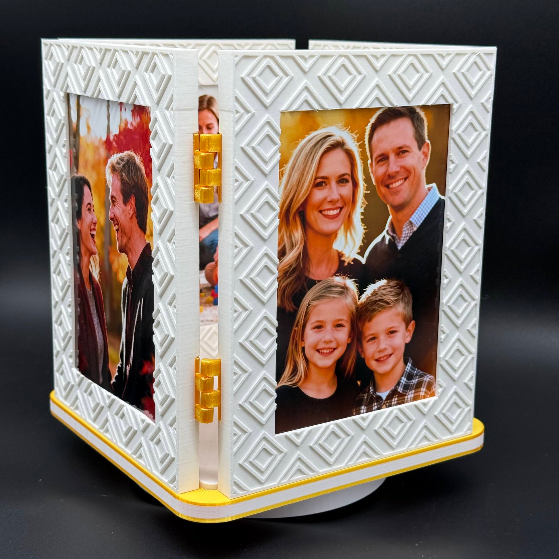 A wonderfully crafted photo frame that can be displayed on a rotating base as a set of 4, or can be displayed as a book with two frames each. Comes in various colors.