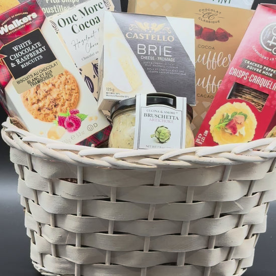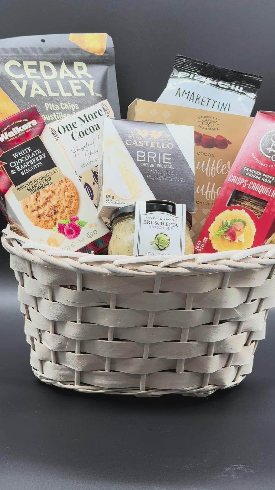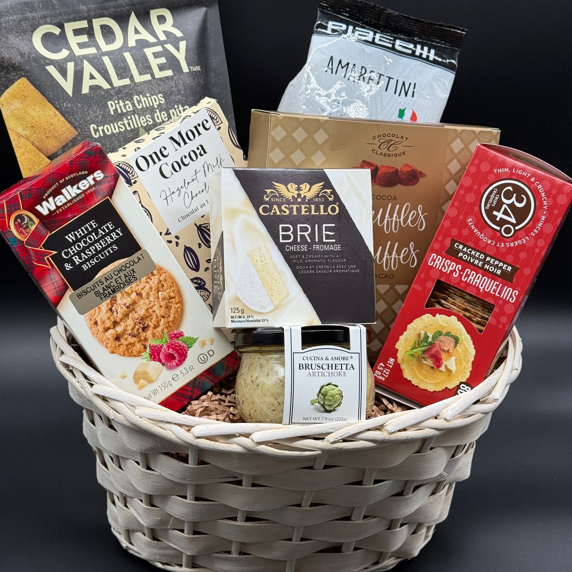 Indulge in the perfect balance of sweet and savory with our Sweet & Savory Symphony gift basket. From the rich, hazelnut chocolate and delicate Italian Amarettini to the crunchy garlic & herb pita chips and creamy Castello Brie, every bite is a celebration of flavors. This curated collection pairs gourmet treats that delight every palate, making it ideal for cozy nights in or festive gatherings. Elevate your snacking experience with a harmonious blend crafted for moments worth savoring.